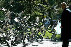 A man feeds pidgeons in Belgrade's Kalemegdan Fortress park, March 2007.