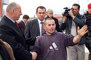 Kosovo's Prime Minister, Agim Ceku, shakes hands with one of the returnees at a ceremony to mark the return of the Roma community to Roma Mahala, Mitrovice/Mitrovica, 30 March 2007.