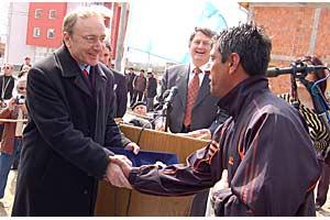 The Special Representative of the UN Secretary General, Joachim Ruecker (left), hands a symbolic key to one of the returnees at a ceremony to mark the return of the Roma community to Roma Mahala, Mitrovice/Mitrovica, 30 March 2007.