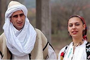 An Albanian boy and a Roma girl in traditional costume getting ready for a joint dance at a ceremony to mark the return of the Roma community to Roma Mahala, Mitrovice/Mitrovica, 30 March 2007.