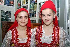 Two Kosovo Bosniak girls wear traditional clothing at an OSCE book donation ceremony, Prizren City Library, 13 February 2007.