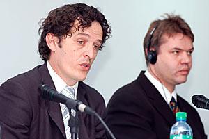 Hilmi Jashari (left), Acting Ombudsperson in Kosovo, makes a point at an OSCE-sponsored roundtable on oversight of the private security industry, Vushtrri/Vucitrn, 27 March 2007.