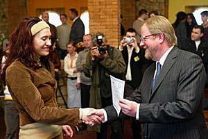Ambassador Hans Ola Urstad, Head of the OSCE Mission to Serbia, hands over a certificate to a participant of a two-month bar exam training course that the Mission supported, Bujanovac, 21 March 2007.