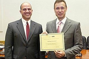 Anthony Pahigian (left), Deputy Head of the OSCE Mission to Serbia, with Predrag Jovanovic, Director of the Public Procurement Office of Serbia, at a seminar on public procurement, 15 March 2007.