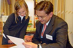 Kazakhstan's Vice-Minister of Environmental Protection Alzhan Braliev talking to one of the students from the United Kingdom who was on a study tour programme on environmental education in Kazakhstan, 4 December 2006.