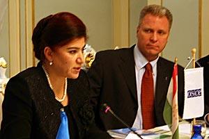 Tajik Deputy Prime Minister Hayrinisso Mavlonova speaks at an OSCE-sponsored forum for women's non-governmental organizations, Dushanbe, 28 November 2006. Acting Head of the OSCE Centre Klaus Rasmussen listens.