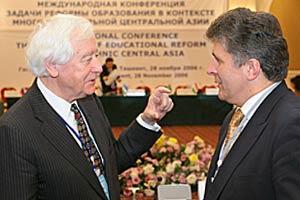 Rolf Ekeus (left), OSCE High Commissioner on National Minorities, speaks to Ambassador Miroslav Jenca, OSCE Project Co-ordinator in Uzbekistan, at a conference on minority education in Central Asia, Tashkent, 28 November 2006.