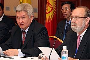 Kyrgyz Prime Minister Felix Kulov (Left) and Bernard Snoy, Co-ordinator of OSCE Economic and Environmental Activities, at a conference on land degradation and soil contamination in Bishkek, 16 November 2006.