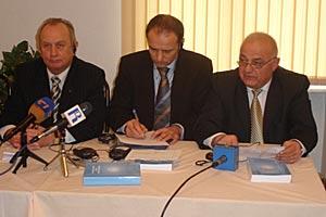 Berry Kralj, Head of ODIHR's Rule of Law Unit (c), Amb. Vladimir Pryakhin, Head of the Office in Yerevan (l) and Tatul Badasyan, Deputy Head of the General Prosecutor's Office Training Centre, present a book on judicial systems, Yerevan, 14 Nov 2006.