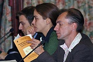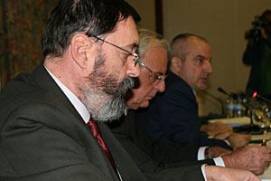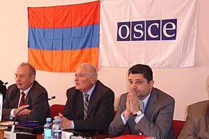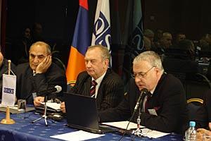 Amb. Vladimir Pryakhin, Head of the OSCE Office in Yerevan (l), Vladimir Barkhudaryan, Vice-President of the National Academy of Sciences (c) and Tigran Sargsyan, Central Bank Chairman, at meeting on global security organized by the Office, 31 Oct 2006.