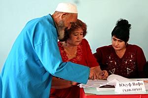 Volunteers assist a voter at a polling station in Dushanbe for Tajikistan's presidential election, 6 November 2006.