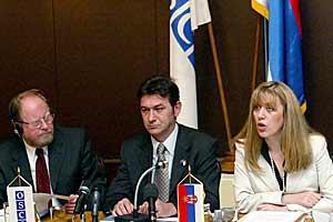 Head of Mission Ambassador Hans Ola Urstad (left), State Secretary of the Serbian Defence Ministry Zvonko Obradovic (centre) and his aide Snezana Markovic-Samardzic attend a conference on women's participation in the army, Belgrade, 4 October 2006.