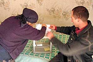 A woman casts her vote in a mobile ballot box in Tbilisi during municipal elections in Georgia, 5 October 2006.