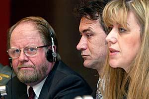 U.S. Ambassador Michael Polt (left), Minister of Finance Mladjan Dinkic (centre) and Head of Mission Ambassador Hans Ola Urstad (right), at a presentation of the report "Money-laundering and Predicate Crime in Serbia 2000-2005", Belgrade, 4 October 2006.