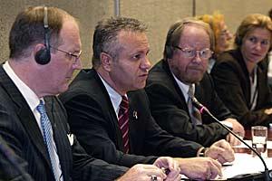 Head of Mission Ambassador Hans Ola Urstad (left), State Secretary of the Serbian Defence Ministry Zvonko Obradovic (centre) and his aide Snezana Markovic-Samardzic at a conference on women's participation in the army, Belgrade, 4 October 2006.