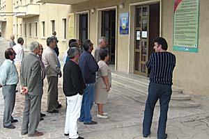 People reading information about their rights posted on the wall of the Lushnja municipality building, September 2006. The Know Your Rights project was initiated by the OSCE Presence in Albania and the People's Advocate.