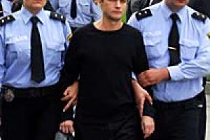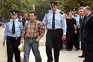Georgian police escorting one of four Russian officers, Arkady Zavgorodny, charged with espionage, in Tbilisi, 2 October 2006. The four were handed over to the OSCE, in the presence of Chairman De Gucht, and later returned to Russia.