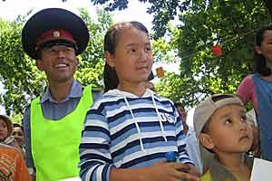A Kyrgyz police officer and members of the local community enjoy the events at the Open Police Day in Bishkek, 10 June 2006.