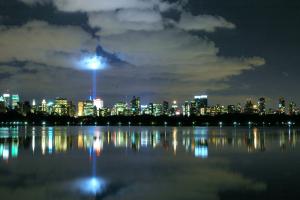 An image by Flickr user LarimdaME – Gene Han – of the Manhattan skyline, featuring the annual 'Tribute in Light' memorial to the victims of 9/11, New York, 11 September 2006.