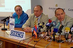 President of the Armenian Sociological Association, Dr Gevorg Poghosyan (r), Head of the Office in Yerevan, Amb. Vladimir Pryakhin (c) and Chair of the Armenian Relief Society, Alvard Petrosyan, present two studies on trafficking, Yerevan, 8 Sept 2006.