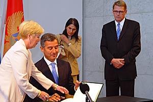 Montenegro's Prime Minister Milo Djukanovic signs the 1975 Final Act of the Conference on Security and Co-operation in Europe, in Helsinki, 1 September 2006. The OSCE was the first international organization Montenegro joined after gaining independence.