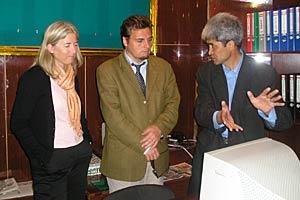 Head of the Osh Field Office of the OSCE Centre in Bishkek, Jerome Bouyjou (c) and the Deputy Director of the OSCE's Conflict Prevention Centre, Monika Wohlfeld (l), with the Director of the Economic Information Dissemination Centre, Bakhtiyar Mamajanov.