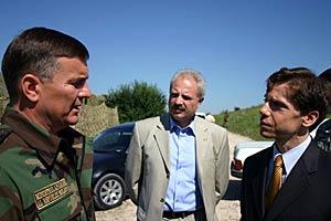 Minister of Defence Valeriu Plesca (l) explains the procedure for destroying Moldova's "Uragan" rocket launch systems to the Head of the OSCE Mission to Moldova, Ambassador Louis O'Neill (r), and Minister for Reintegration, Vasile Sova (c), 25 July 2006.