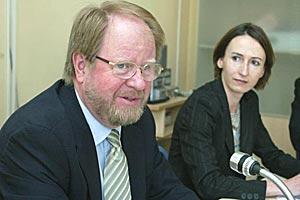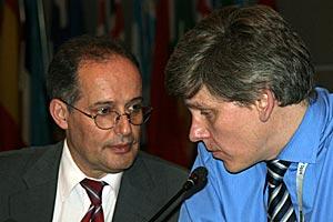 Miklos Haraszti (left), the OSCE Representative on Freedom of the Media, speaks with the Director of his Office, Roland Bless, at a media conference in Vienna, 13 July 2006.