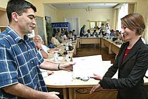 Milisav Pajevic (left) receives a certificate on the completion of a journalism workshop organized by the OSCE Mission to encourage objective reporting on the state of the environment in the region, Sabac, Serbia, 29 July- 1 August 2006.