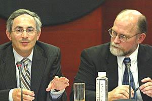The outgoing Deputy Head of Mission Douglas Wake (left) and UNDP Representative David Lance Clark, at a panel discussion on advancing human security in Serbia, 10 July 2006.