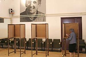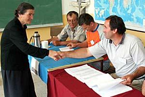A voter is welcomed at a polling station during a referendum on the future state-status of Montenegro, in the town of Cetinje, 21 May 2006.