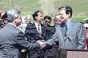 OSCE Secretary General Marc Perrin de Brichambaut (right) shakes hands with Armenian Defence Minister Serge Sargsyan at the opening of a "melange" processing installation at Kaltakhchi, Lori province, 12 May 2006.