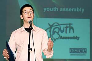 A member of the Mitrovica Youth Assembly speaks at an OSCE-organized event on 11 May 2006. The OSCE Mission supports youth involvement in municipal decision-making through advice and training activities for twelve Youth Assemblies across Kosovo.