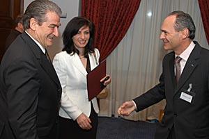Head of the OSCE Presence in Albania Pavel Vacek (right) welcomes Prime Minister Sali Berisha and Assembly Speaker Jozefina Topalli to a regional workshop on enhancing the role of parliamentarians in fighting organized crime, Tirana, 11 April 2006.
