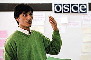 Strategic planning expert Ismet Krueziu explains to village leaders in Kosovo how to request services from their municipalities at an OSCE workshop in Prizren, 4 April 2006.