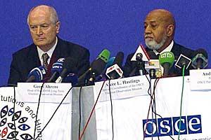 Amb. Geert Ahrens (Left), Head of the ODIHR long-term observation mission, and Alcee Hastings, president of the OSCE Parliamentary Assembly, deliver the results of the OSCE observation of the Belarus presidential election in Minsk, 20 March 2006.