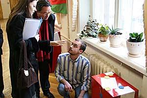 Ambassador Christian Strohal (centre), Director of OSCE's Office for Democratic Institutions and Human Rights, checks a ballot box used for early voting in the Belarus presidential election, in Minsk 19 March 2006.