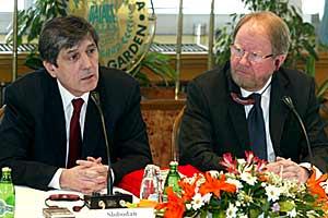 Serbian Minister for Labour, Employment and Social Affairs Slobodan Lalovic (right) and Head of the OSCE Mission Hans Ola Urstad at a conference on moving towards the adoption of a gender equality law, Belgrade, 16 March 2006.