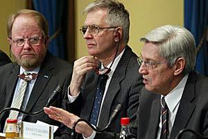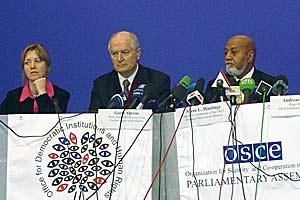 Ambassador Geert Ahrens (C), Head of the ODIHR long-term observation mission, and Alcee Hastings (R), president of the OSCE Parliamentary Assembly, deliver the results of the OSCE observation of the Belarus presidential election in Minsk, 20 March 2006.
