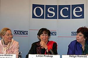 OSCE Special Representative on Combating Trafficking in Human Beings Helga Konrad (2nd l), Austrian Interior Minister Liese Prokop (2nd r) and EU Commissioner Benita Ferrero-Waldner (r) at an OSCE conference on human trafficking in Vienna, 17 March 2006.