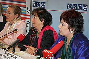 OSCE Special Representative on Combating Trafficking in Human Beings Helga Konrad (r) with Austrian Interior Minister Liese Prokop (c) and EU Commissioner Benita Ferrero-Waldner (l) at a news conference in the Hofburg in Vienna, 17 March 2006.