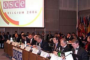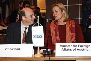 Austrian Foreign Minister Ursula Plassnik with the Chairman of the Permanent Council, Ambassador Bertrand de Crombrugghe.