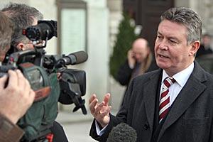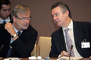 OSCE's Chairman-in-Office in 2006, Belgian Foreign Minister Karel De Gucht (right), consults with Belgian Senator Pierre Chevalier (left), Special Envoy of the Belgian OSCE Chairmanship.