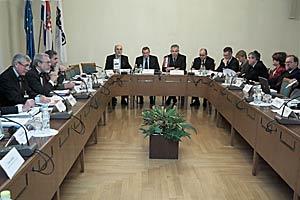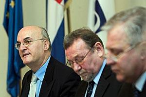 Head of the OSCE Mission to Croatia Jorge Fuentes (left), Speaker of the Croatian Parliament Vladimir Seks (centre) and Croatian Prime Minister Ivo Sanader at a meeting on electoral reform at the Croatian Parliament, Zagreb, 13 December 2005