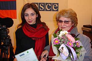 Inga Zarafyan of VEM studio (right) and Mary Chakryan of Kentron TV, in Yerevan, 12 December 2005. They got the first and second prizes of the annual competition for environmental journalism, organized by the OSCE Office in Yerevan and the Aarhus Centre.