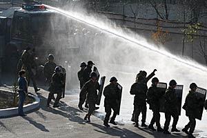 Officers take part in a crowd-control exercise, part of a week-long training programme for law enforcement agencies in Azerbaijan, Baku, December 2005.