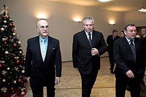 Head of the OSCE Mission to Croatia Jorge Fuentes (left), Croatian Prime Minister Ivo Sanader (centre) and Speaker of the Croatian Parliament Vladimir Seks at a meeting on electoral reform at the Croatian Parliament, Zagreb, 13 December 2005.