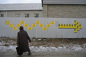 Posters on a wall in Kostanai, northern Kazakhstan, spell out the name of President Nazarbayev, who was re-elected by an overwhelming majority in the 4 December 2005 vote.