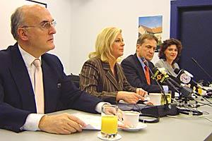 (L-R:) Mission Head Jorge Fuentes, Foreign and European Integration Minister Kolinda Grabar-Kitarovic, Development Minister Bozidar Kalmeta, and Spokesperson Ivana Crnic launch a public awareness campaign on the return of refugees, 30 November 2005.