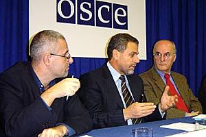 Deputy Head of Mission Douglas Wake (left), ODIHR Director Christian Strohal (centre), and Minister of Human and Minority Rights Rasim Ljajic, at a regional conference on the civil registration of Roma in South-Eastern Europe, Belgrade, 28 November 2005.